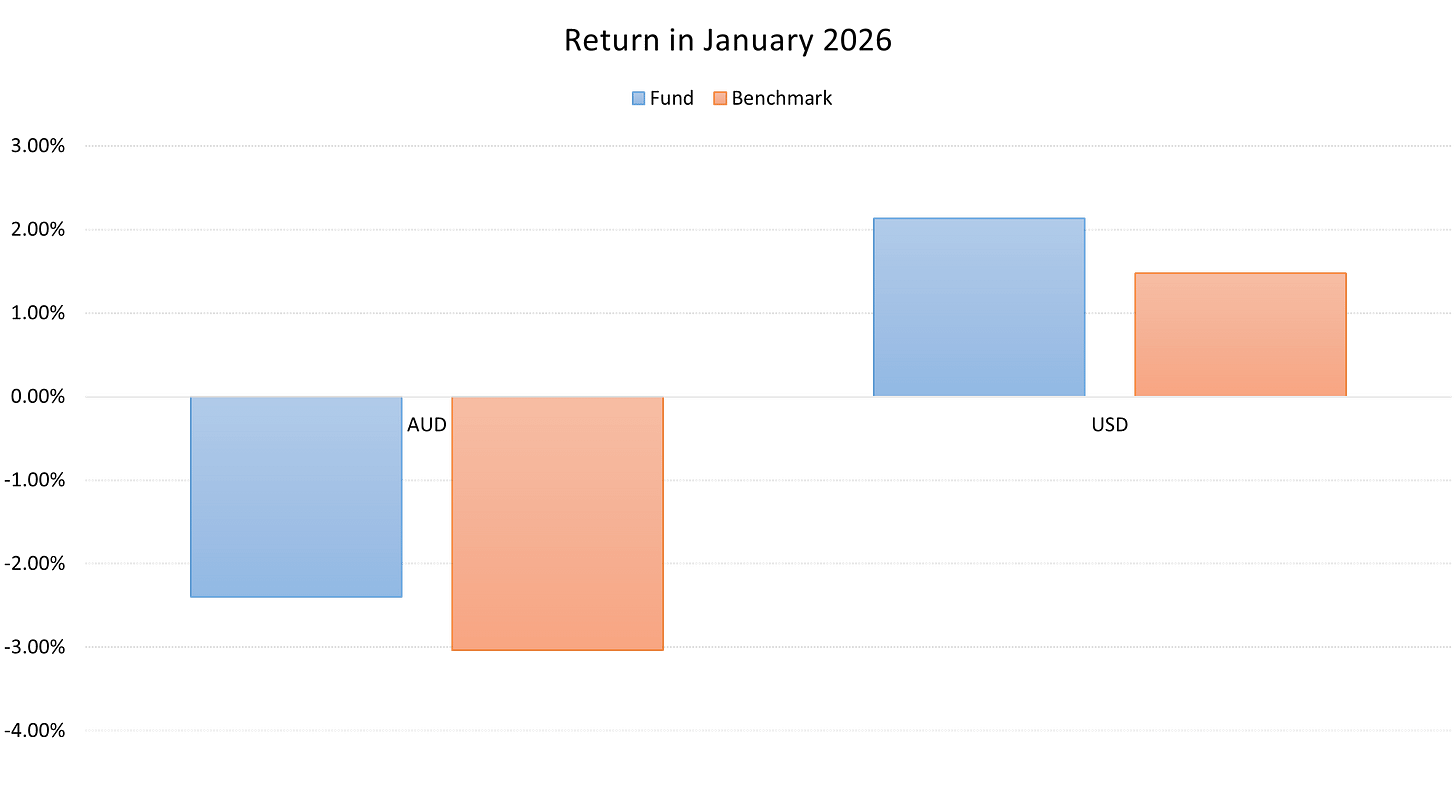 We performed reasonably in January, with a modest outperformance. In USD terms, we achieved 2.15% (vs benchmark of 1.47%). However, the AUD increased significantly in January on the back of anticipation that the Reserve Bank would hike interest rates. Thus, in AUD terms, we delivered -2.4% (bs benchmark of -3.03%).